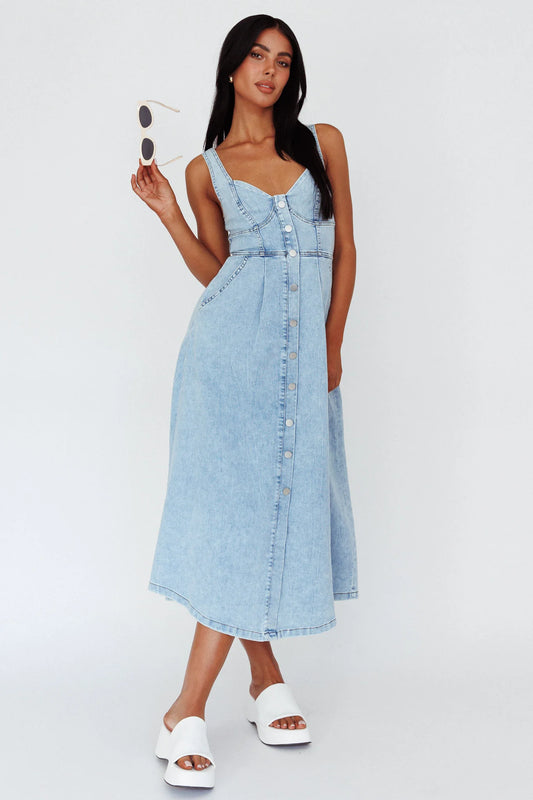 CM6178D DENIM BLUE STRETCH MIDI DRESS