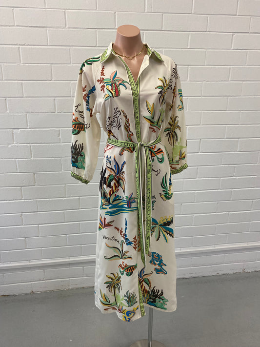 258160 CREAM PRINTED SHIRT MIDI DRESS