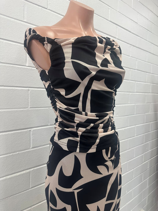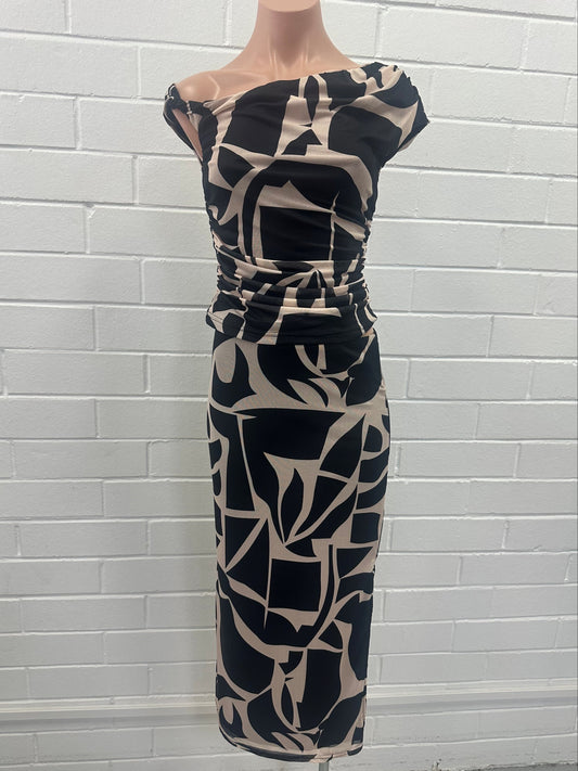 82769 BLACK ASYMMETRICAL SHOULDER MIDI DRESS